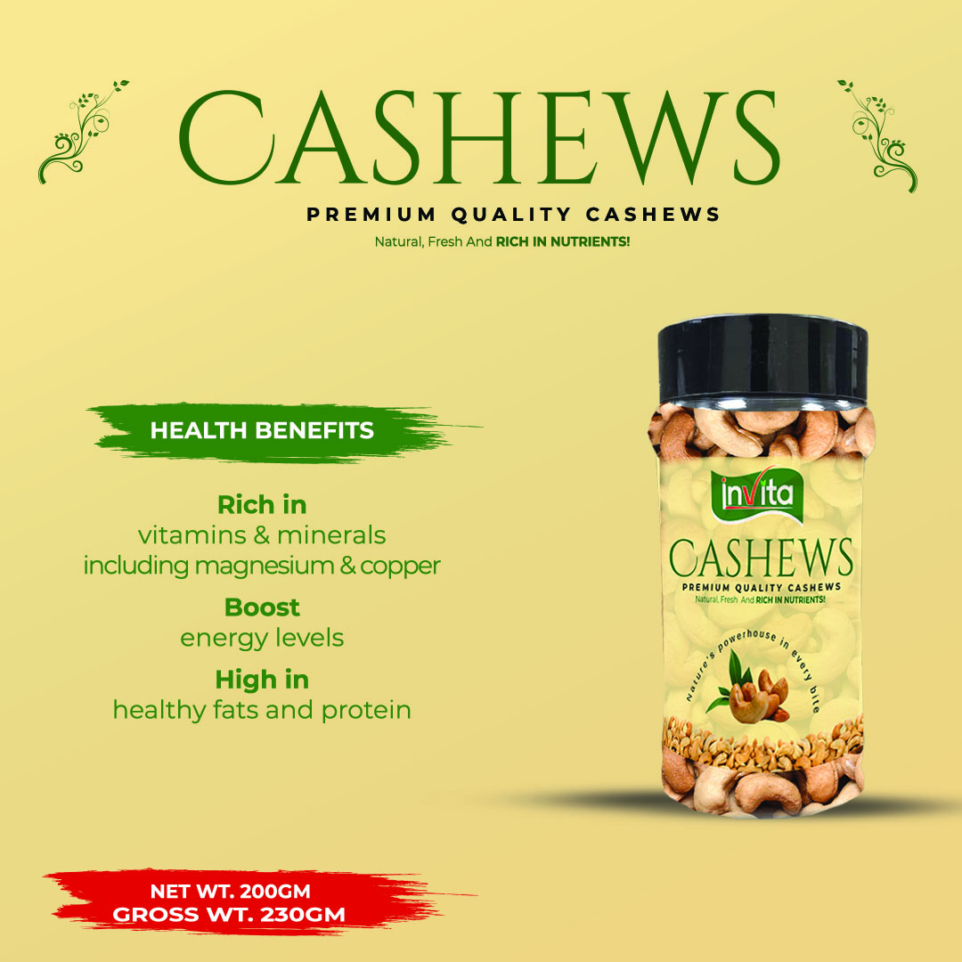 Indulge in the creamy, rich taste of Invita Cashews, elegantly packed in a transparent, convenient jar that preserves freshness and makes snacking easy. Our premium cashews are carefully selected for superior quality, offering a perfect flavour blend and health benefits. High in essential nutrients, healthy fats, and protein, these cashews are ideal for snacking, baking, or adding a crunch to your favourite dishes. Enjoy premium quality in every bite!